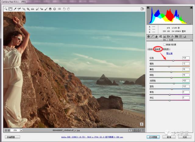 接下来,我们需要一个基本的调色。增加饱和度里的红色,主要是为了减少人物皮肤的暖光线,让皮肤稍变得偏淡。