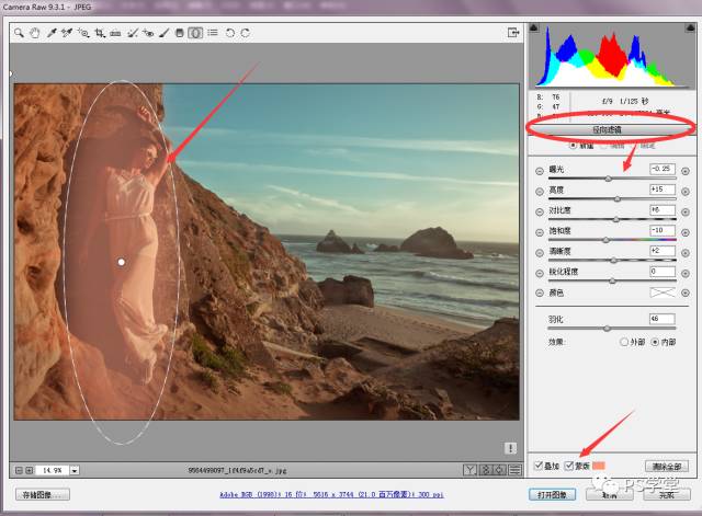 接下来,我要使用我最爱的工具。 “径向渐变”,我需要给人物单独调整