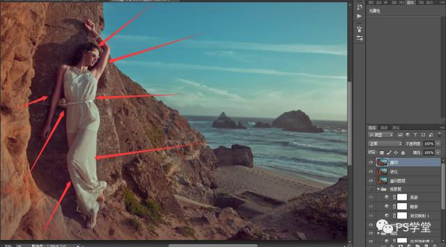 开始对人物的整个形体塑性,这个地方需要小幅度的液化,然后对我图片打箭头的位置来液化,整个模特身体更修长,看起来更舒服美观。