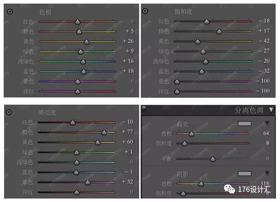 (2)增加橙色的饱和度,降低黄色和绿色的饱和度,使得画面具有复古感;
