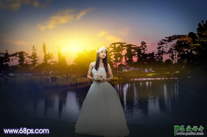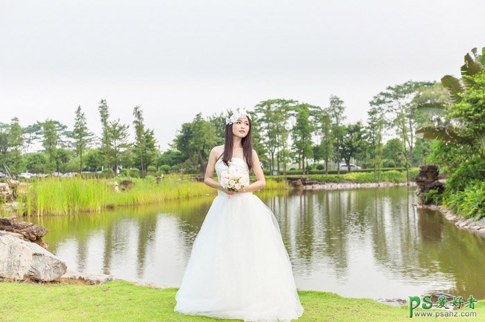 Ps婚纱照调色教程:给池塘边拍摄的清纯女生婚纱照调出黄昏夕阳色
