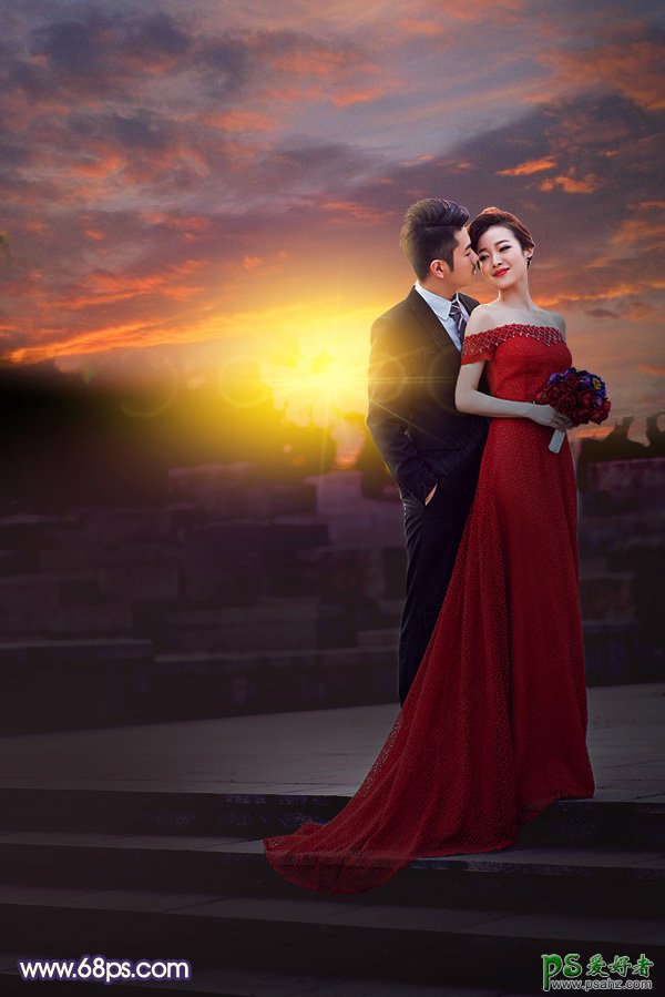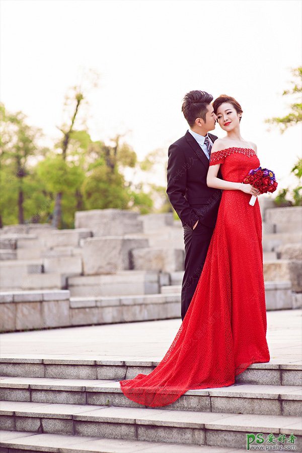 Photoshop给外景拍摄的红色长裙美女婚纱艺术照调出大气的红色霞