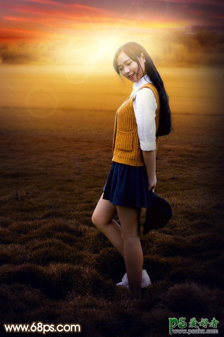 Photoshop草坪上拍摄的美艳女生艺术照调出暖暖的霞光色彩,素材图片远处的背景有点杂乱,同时天空有点泛白。处理的时候直接把天空及杂乱的背景都加上天空素材;然后再增加暖色,整体柔化处理一下即可,喜欢的朋友们好好学习一下。