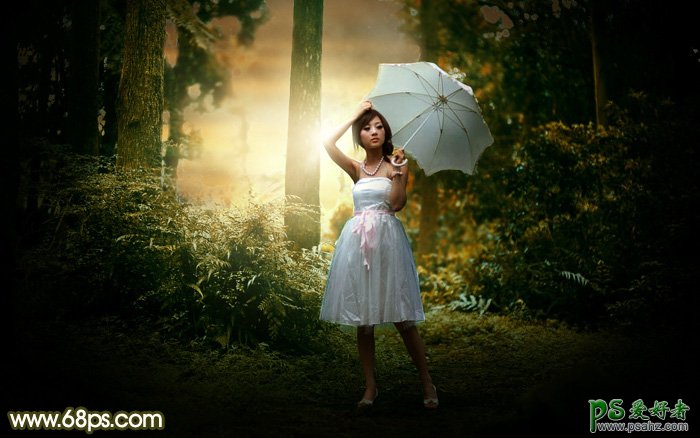 Photoshop给漂亮的森系美眉婚纱照调出黄褐色逆光效果,唯美意境风格的森系美女婚片后期调色教程实例,过程很简单,处理的时候,我们给天空部分换上霞光素材,再渲染出阳光效果;然后把主色转为暖色即可。