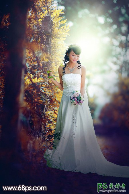 Photoshop给树林中拍摄的甜美少女婚纱照调出青红色逆光效果