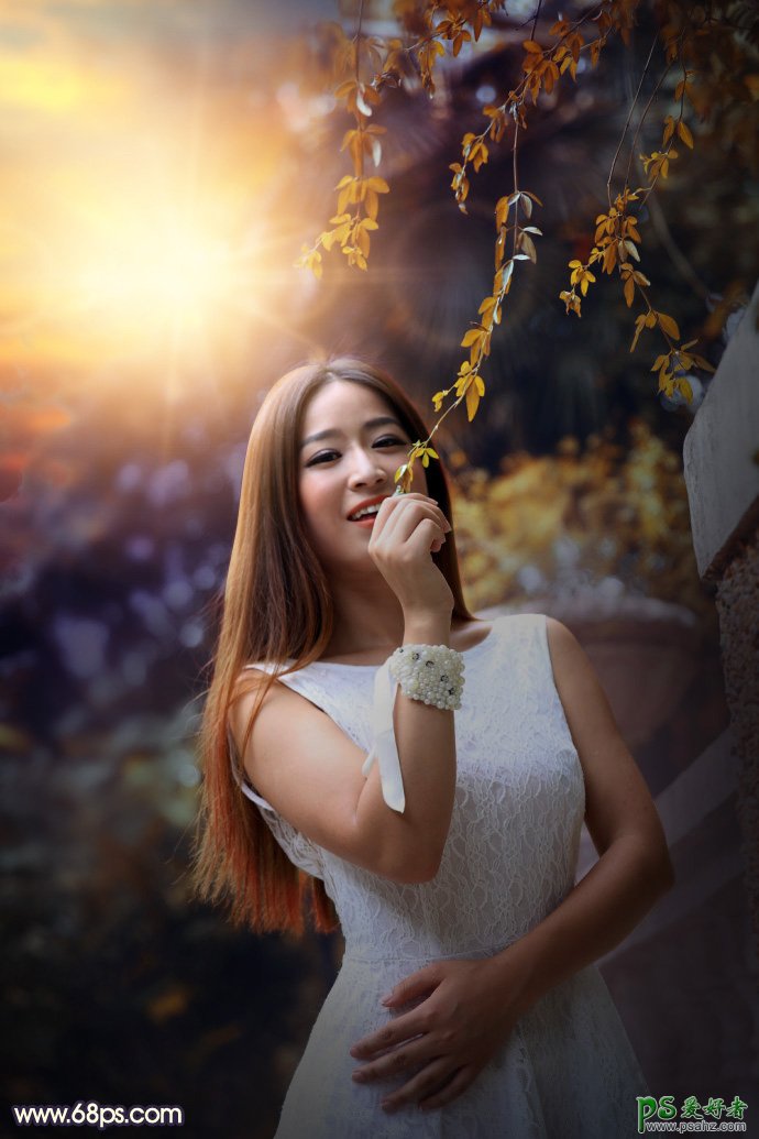 Photoshop给身材丰满的性感少妇外景照片调出温馨的暖色调,素材图是在路边的围墙边拍摄的,背景比较杂乱;我们处理的时候,可以用模糊工具把杂乱的背景模糊处理,然后把杂乱的边角区域压暗;再给天空部分加上霞光素材,最后再整体渲染和柔化处理一下即可。