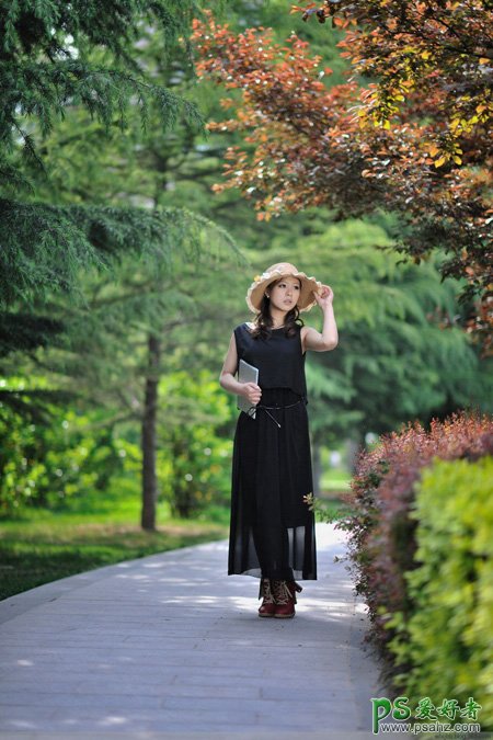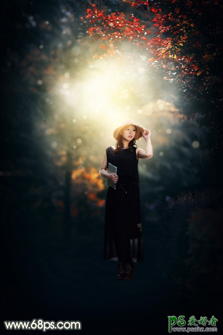 PS人像修饰,人像后期美化调色教程:给小路上自拍的唯美女生照片调出暗调蓝黄色。我们的素材图是在秋景中拍摄的,我们可以给背景部分增加更多的暖色;再把暗部压暗,增加一些冷色;最后再给整体渲染出高光及暖色调即可。