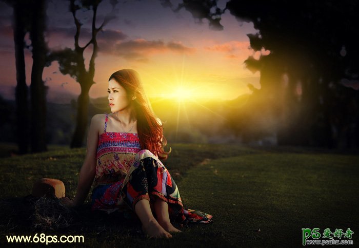 Photoshop给公园草坪上拍摄的童颜美女性感照片调出唯美的晨曦逆光色,素材图是张美腿玉足童颜美女照片,照片中的美女光着脚拍摄的,让人一看就非常喜欢,我们先把背景天空部分换上霞光素材;然后在合适的位置渲染出阳光;再把图片边角区域压暗,主色多增加一些暖色;最后我们再美化一下人物的整体即可实现。