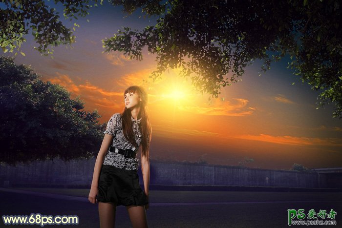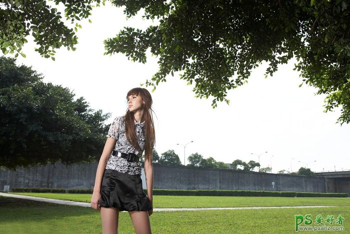 Photoshop给球场草坪中的超短裙女生照片制作出唯美绚丽风格的霞光色,素材图片天空区域在大树和草地的中间,换天空的时候最好找一幅视角接近的天空素材;更换后再给天空部分渲染阳光,局部再加强一下光影即可。 原图