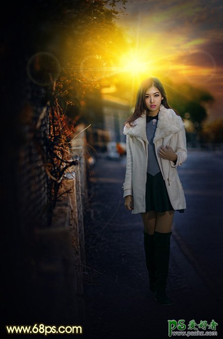 PS调色教程:给漂亮的公主小妹街景照片调出唯美的暗黄色,漂亮妹妹后期调色美化教程,素材图片比较杂乱,处理的时候先给图片泛白的天空换上霞光素材;然后用较暗的画笔把杂乱区域及边角部分涂暗;最后我们再给天空渲染出黄色阳光即可。