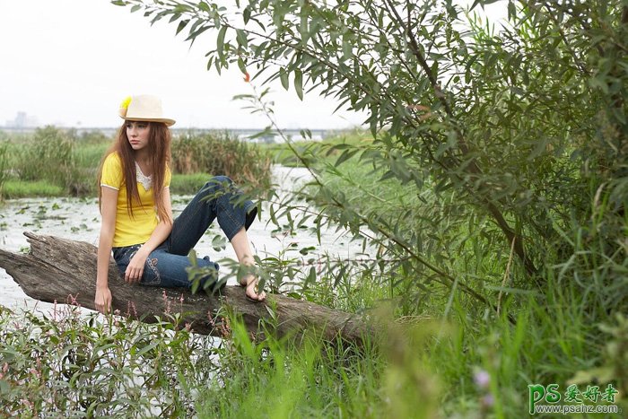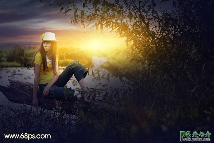 Photoshop给郊野水塘边自拍的性感美女模特艺术照片调出梦幻夕阳色彩,处理的时候,先给天空和水面部分增加霞光;然后给图片增加暖色,并把暗部大幅压暗;最后给图片渲染一些阳光效果,喜欢美女后期调色的朋友们好好学习一下吧!