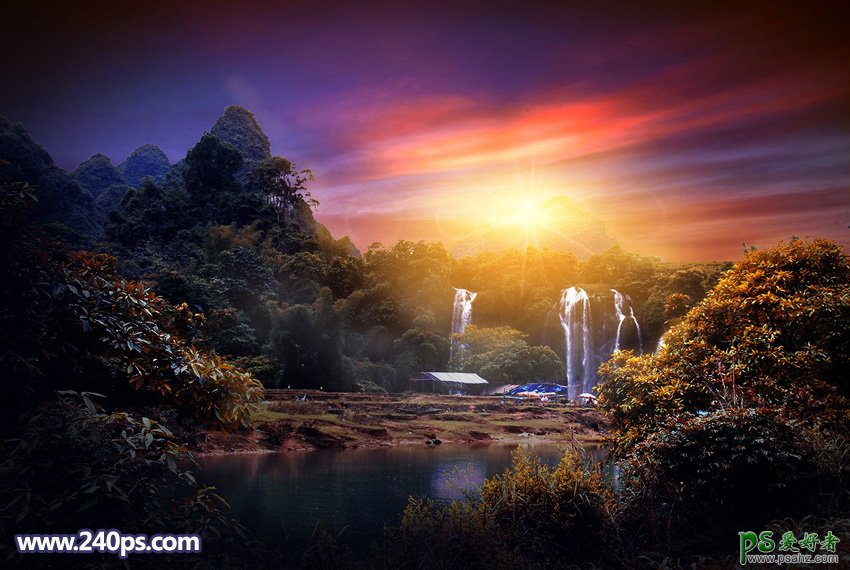 Photoshop给大气的瀑布风景图片调出唯美的蓝红色霞光色彩,原图素材拍摄的非常大气,不过天空部分泛白,整体没有特色;先需要给图片换一个天空;然后用调色工具给图片增加暖色,局部区域需要大幅压暗,模拟出较暗的环境;最后渲染出阳光给画面增加生气。 最终效果