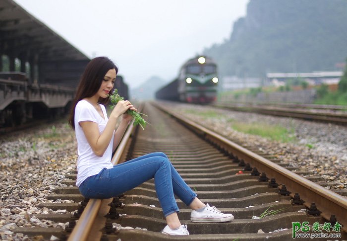 Photoshop给铁轨上外拍的可爱女生性感