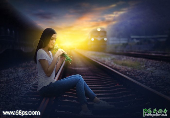 Photoshop给铁轨上外拍的可爱女生性感照片调出意境般的晨曦色