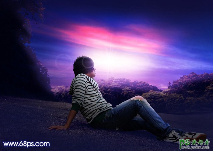 Photoshop给草坪上拍摄的可爱暖男外景照调出唯美紫色霞光效果,素材图片天空泛白的区域较多,感觉非常空;处理的时候先给天空换上较暗的霞光素材;然后把地面颜色转为暗蓝色,保留一点暖色;最后给图片加上高光,并把边角区域压暗即可。 原图