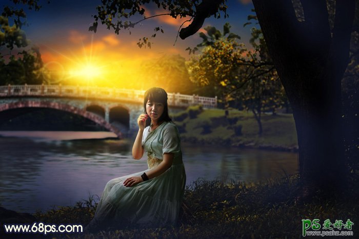 PS调色教程:给公园小河边自拍的白色连衣裙少妇调出唯美的晨曦色