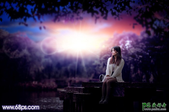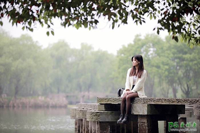 Photoshop给公园树林中等着约会的女生写真照调出温暖的霞光...