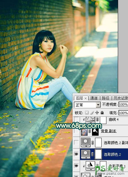 PS女生照片调色:给街头围墙边的唯美女生写真照调出甜美的青红色