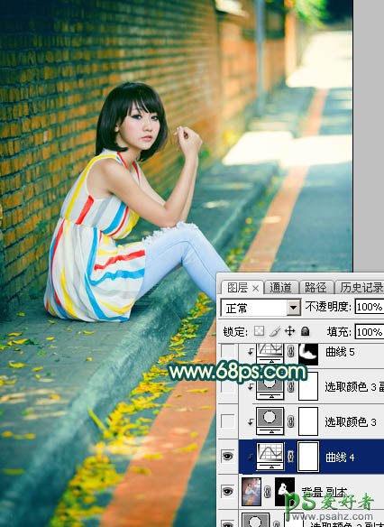 PS女生照片调色:给街头围墙边的唯美女生写真照调出甜美的青红色