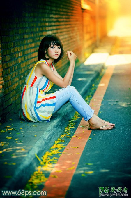 PS女生照片调色教程:给街头围墙边自拍的唯美女生写真照调出甜美的青红色,青红色是非常实用的甜美色,调色的时候只需要用曲线等给图片暗部增加青绿色,并适当调暗;最后再增加高光及柔化处理即可实现。