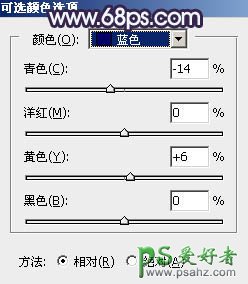 19、创建可选颜色调整图层,对蓝、洋红、白进行调整,参数设置如图44 - 46,效果如图47。这一步给图片增加淡蓝色。