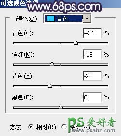 2、创建可选颜色调整图层,对绿色,青色进行调整,参数及效果如下图。这一步把图片中的青绿色调淡一点。