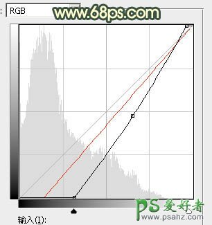 10、创建曲线调整图层,对RGB,红通道进行调整,参数设置如图28。确定后把蒙版填充黑色,然后用柔边白色画笔把边角区域涂暗一点,效果如图29。这一步给图片增加暗角。