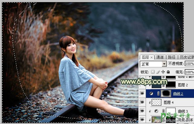 Photoshop给外景铁路上自拍的可爱女生生活照调出唯美的黄昏色彩