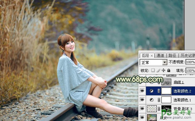 Photoshop给外景铁路上自拍的可爱女生生活照调出唯美的黄昏色彩