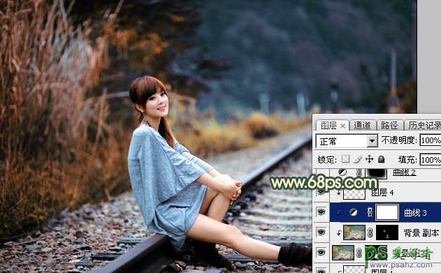 Photoshop给外景铁路上自拍的可爱女生生活照调出唯美的黄昏色彩