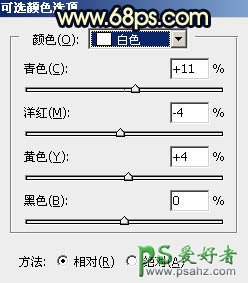 18、创建可选颜色调整图层,对红、黄、白进行调整,参数设置如图32 - 34,确定后创建剪切蒙版,效果如图35。这一步给人物部分增加暖色。