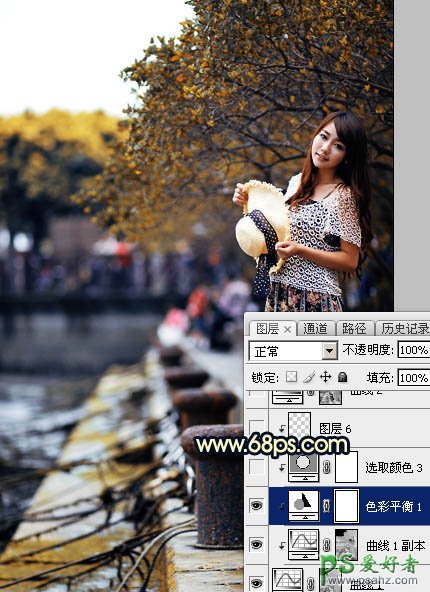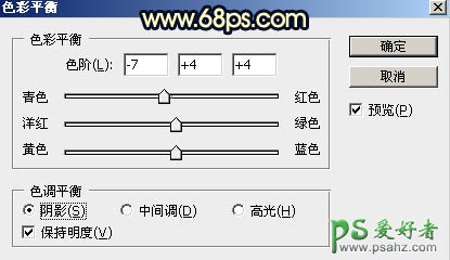 5、创建色彩平衡调整图层,对阴影,高光进行调整,参数设置如图10,11,确定后创建剪切蒙版,效果如图12。这一步给图片暗部增加青蓝色。