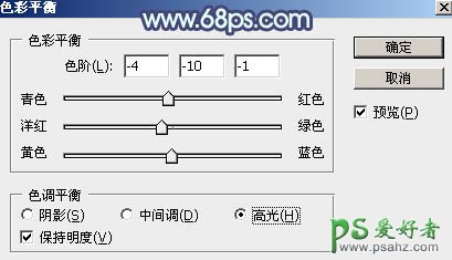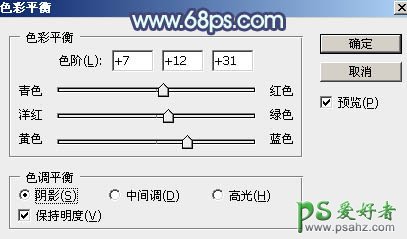 8、创建色彩平衡调整图层,对阴影,高光进行调整,参数设置如图20,21,确定后按Ctrl + Alt + G 创建剪切蒙版,效果如图22。这一步同样给暗部增加蓝色。