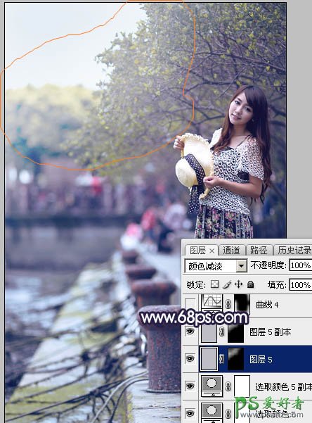 16、创建纯色调整图层,颜色设置为蓝灰色:#BFBEC6,确定后把蒙版填充黑色,然后用透明度较低柔边白色画笔把下图红圈部分涂出来,再把混合模式改为“颜色减淡”。这一步给图片局部增加高光。