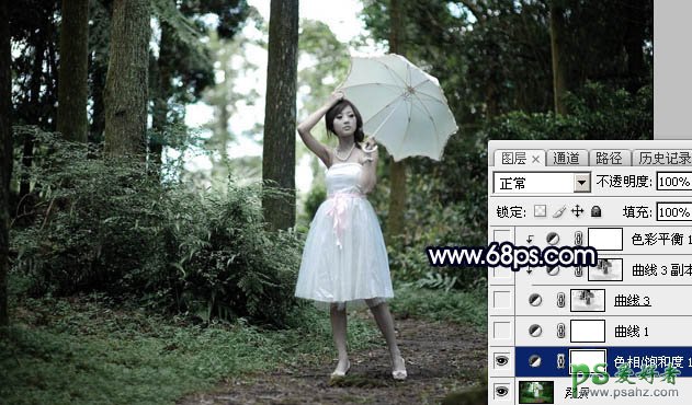 Photoshop给绿色树林中自拍的美女风光照片调出暗夜霞光色调,我们设计师处理的时候先降低主色饱和度;然后用曲线给整体及暗部增加蓝色;再背景渲染一下高光,局部地区增加明暗度即可实现唯美的霞光色彩,推荐给喜欢影楼后期修图调色师们练习一下。