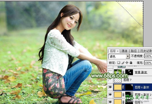 16、按Ctrl + J 把当前纯色调整图层复制一层,混合模式改为“滤色”,不透明度改为:100%。然后用透明度较低柔边白色画笔把高光区域涂小一点,效果如下图。这几步给图片增加淡黄色高光。