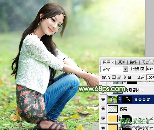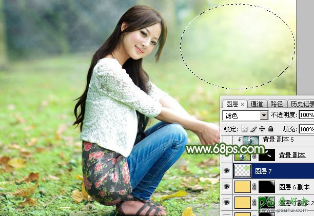 17、新建一个图层,用椭圆选框工具拉出下图所示的椭圆选区,羽化55个像素后填充淡绿色:#ACE085,取消选区后把混合模式改为“滤色”,效果如下图。这一步给图片增加淡绿色高光。