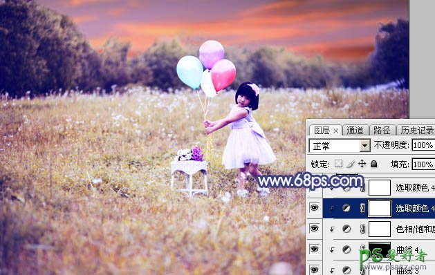 PS调色教程:给可爱的小女孩儿外景生活照调出梦幻的蓝红色,霞光