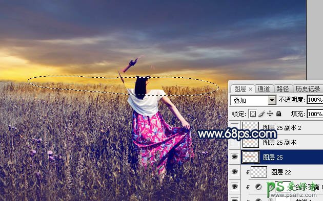 15、新建一个图层,用套索工具勾出下图所示的选区,羽化25个像素后填充黄褐色:#BA7705,取消选区后把混合模式改为“叠加”,效果如下图。
