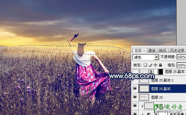16、按Ctrl + J 把当前图层复制一层,锁定像素区域后,用油漆桶工具填充橙黄色:#F9C485,然后把混合模式改为“滤色”,并按Ctrl + T 稍微缩小一点。