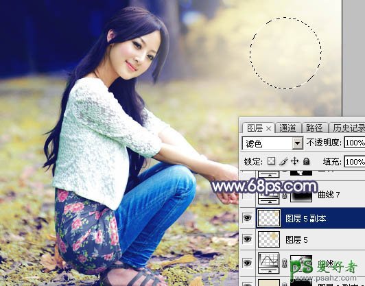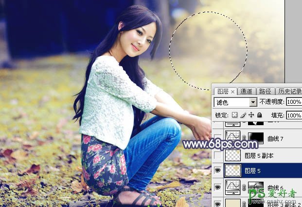 19、新建一个图层,用椭圆选框工具拉出下图所示的选区,羽化45个像素后填充淡黄色:#DBC883,取消选区后把混合模式改为“滤色”,效果如下图。