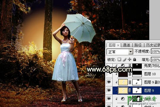 17、新建一个图层,创建剪切蒙版,把前景色设置为淡黄色;然后用透明度较低柔边画笔把人物左侧受光区域涂上淡黄色,如下图。