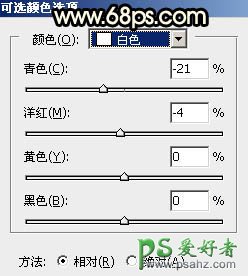 2、创建可选颜色调整图层,对黄、绿、白进行调整,参数设置如图6 - 8,确定后用黑色画笔把人物右侧局部擦出来,如图9。这一步给图片增加红褐色。