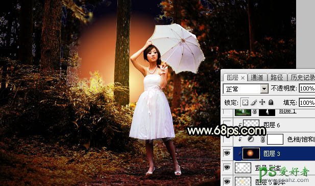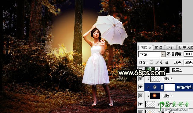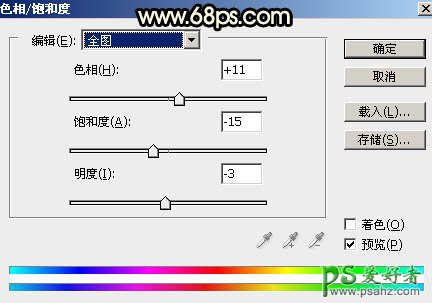 13、创建色相/饱和度调整图层,对全图进行调整,参数设置如图25,确定后创建剪切蒙版,效果如图26。这一步微调天空部分的颜色。