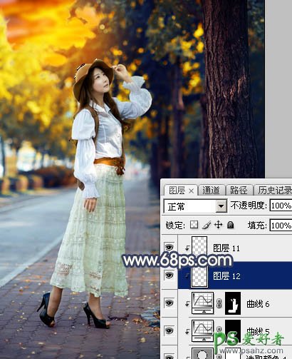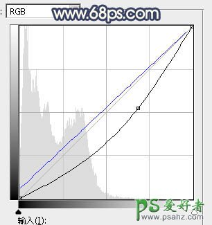 26、创建曲线调整图层,对RGB,蓝通道进行调整,参数设置如图40,确定后把蒙版填充黑色,然后用透明度较低柔边白色画笔把右侧及底部区域涂暗一点,效果如图41。这一步给图片增加暗角。