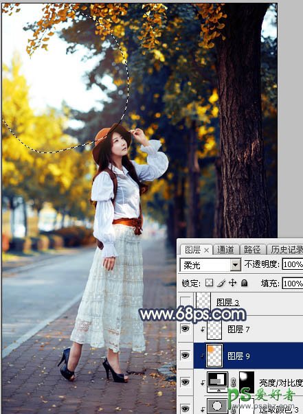 9、新建一个图层,创建剪切蒙版,用套索工具勾出下图所示的选区,羽化35个像素后填充橙红色:#F7A238,取消选区后把混合模式改为“柔光”,效果如下图。这一步给暗部局部增加暖色。