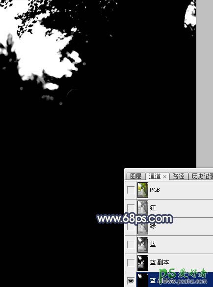 13、按住Ctrl + 鼠标左键点击通道面板蓝副本通道缩略图载入选区;点RGB通道返回图层面板。新建一个图层,用油漆桶工具填充白色,取消选区后把背景副本图层隐藏,效果如下图。