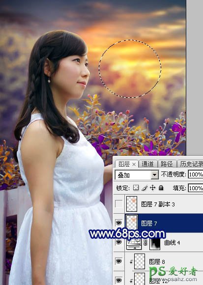 22、新建一个图层,用椭圆选框工具拉出下图所示的选区,羽化35个像素后填充橙红色:#E59152,取消选区后把混合模式改为“叠加”,效果如下图。
