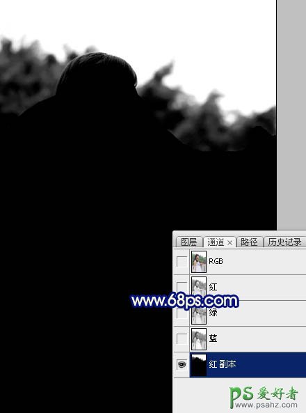 12、进入通道面板,把红色通道复制一份,得到红副本通道。按Ctrl + M 对红副本通道调整曲线,把天空部分调成白色,暗部调暗,确定后再用黑色画笔把天空以外的区域涂黑,效果如下图。