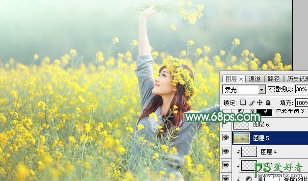 14、新建一个图层,按Ctrl + Alt + Shift + E 盖印图层。再选择菜单:滤镜 > 模糊 > 动感模糊,角度设置为-45度,距离设置为150,确定后把混合模式改为“柔光”,不透明度改为:30%,效果如下图。这一步把图片柔化处理。